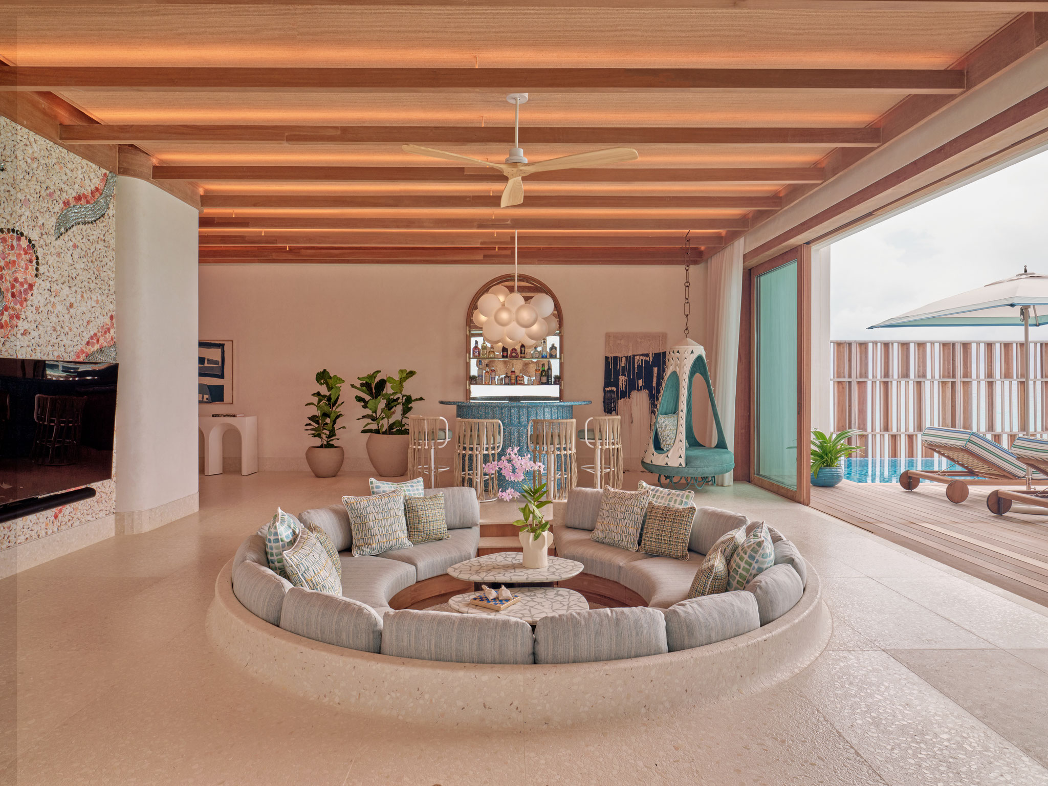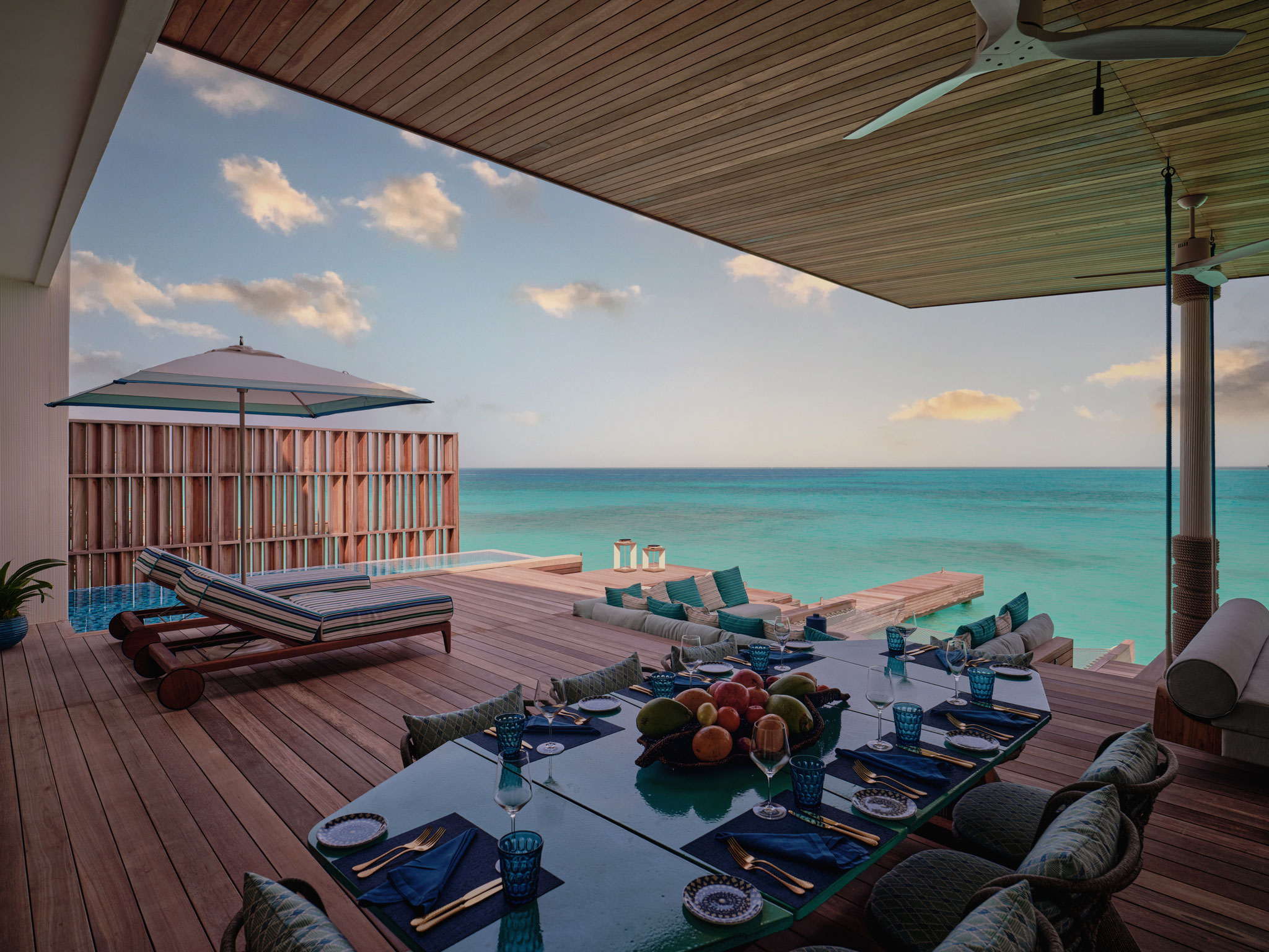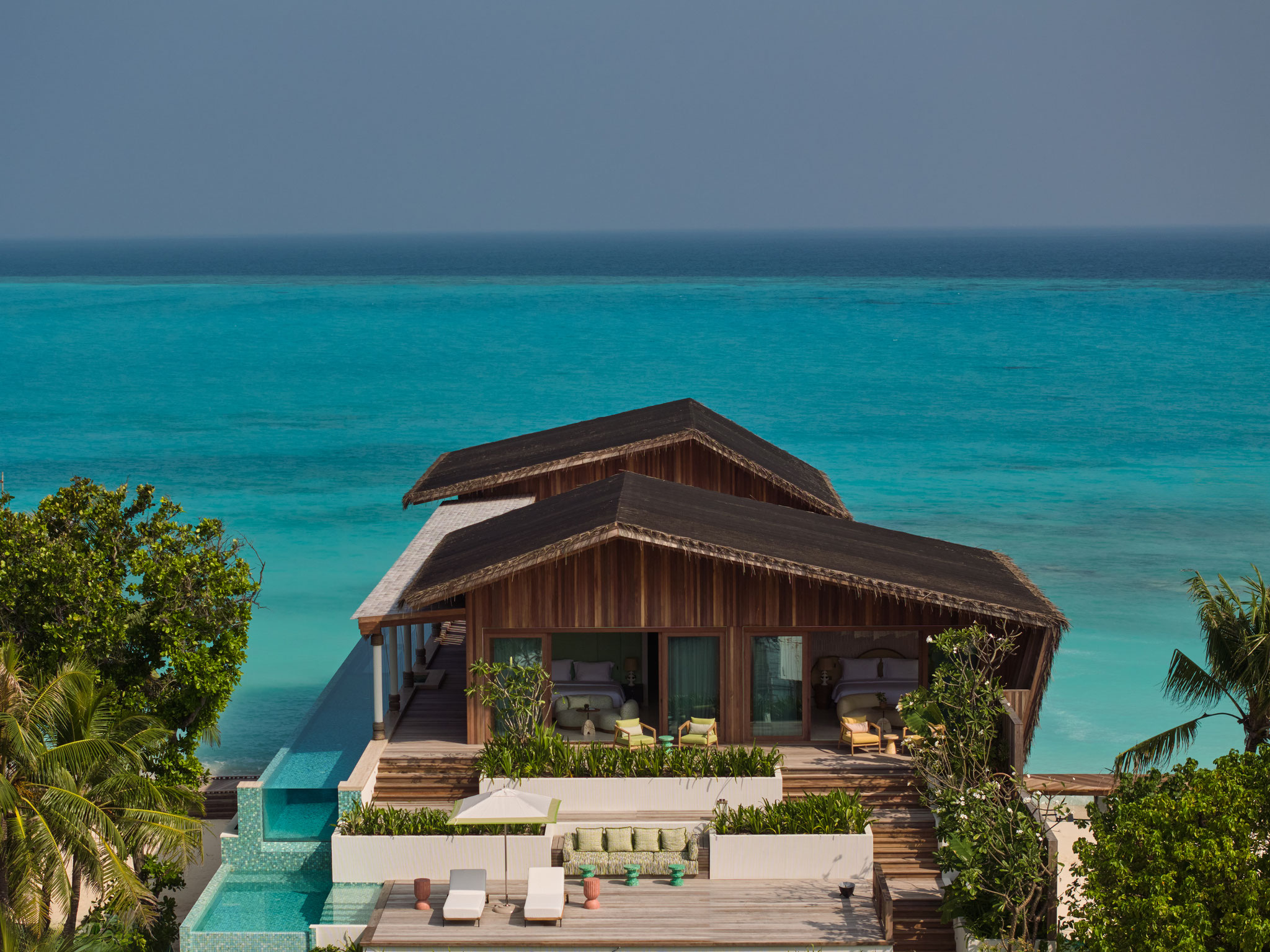 Ob über dem türkisblauen Wasser schwebend und zugleich mit eigenem Strandabschnitt verbunden – die Residenzen von .Here vereinen das Beste aus zwei Welten. Privatsphäre und Weite sind hier keine Wahl, sondern selbstverständlich. Infinity-Pools verschmelzen mit dem Horizont, private Stege führen direkt ins Meer, und das von Dhoni-Booten inspirierte Design verbindet Ursprünglichkeit mit zeitloser Eleganz.